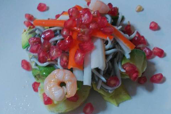 Ensalada de Granada con gulas, gambas, cangrejo, patata y aguacate